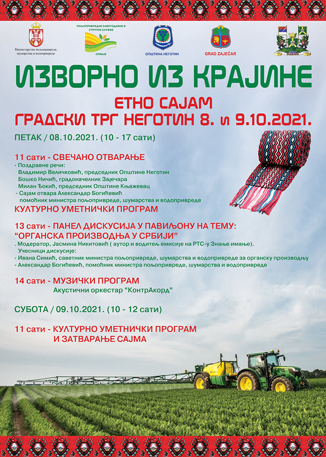 Свечано отварање етно сајма „Изворно из Крајине” заказано је за 11:00 сати, у петак 8. октобра. Присутнима ће се обратити: председник општине Неготин Владимир Величковић, градоначелник Зајечара Бошко Ничић, председник општине Књажевац Милан Ђокић, а сајам ће отворити помоћник министра пољопривреде, шумарства и водопривреде Александар Богићевић.