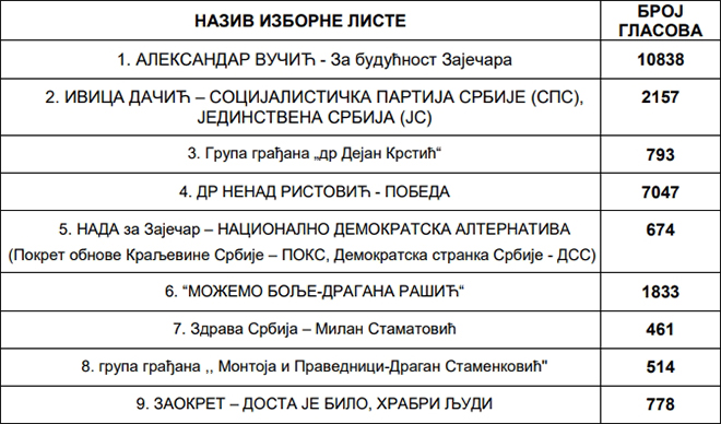Изборне листе добиле су следећи број гласова и одборничких мандата у Скупштини Града Зајечара: