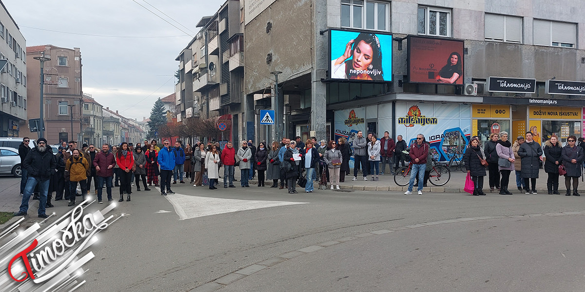 Građani, predstavnici opozicionih stranaka i aktivisti blokirali su na 15 minuta kružni tok u centru Zaječara, tačno u 11:52 časova, dok je deo kolektiva Gimnazije u Zaječaru izašao u dvorište srednjoškolskog centra.