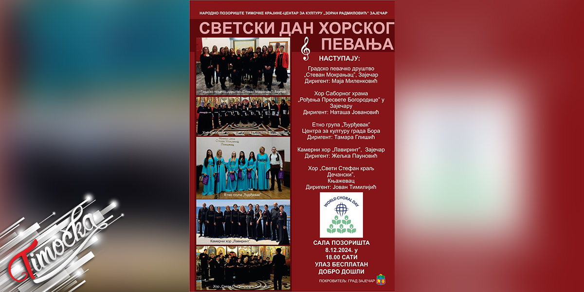 Svetski dan horskog pevanja biće obeležen u zaječarskom pozorištu, besplatnim koncertom horova iz Zaječara, Bora i Knjaževca, u nedelju 8. decembra 2024.