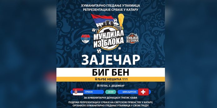 У клубу „Биг Бен“ у Зајечару биће организовано заједничко гледање утакмице фудбалске репрезентације Србије у Катару, где ће сви заинтересовани моћи да донирају новац у хуманитарне сврхе, а сви који донирају средства добиће гратис кафу. Почетак хуманитарног догађаја је у 20:00 сати, када и почиње утакмица Србија-Швајцарска.