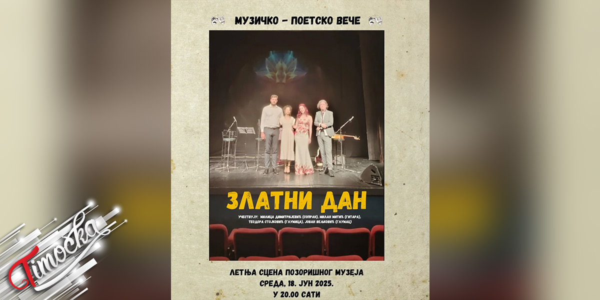 Дружења на летњој сцени Позоришног музеја у Зајечару настављају се фантастичним музичко-поетским програмом „Златни дан“, у среду 18. јуна 2025.