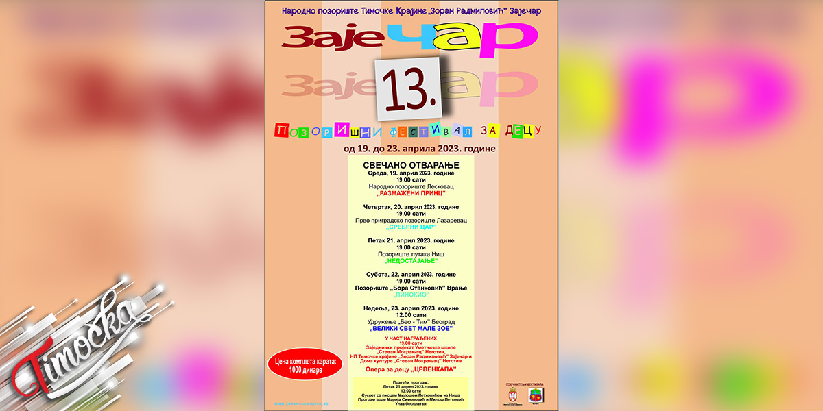 Timočka KrajinaZaječarOd 19. do 23. aprila biće održan 13. Festival pozorišta za decu...