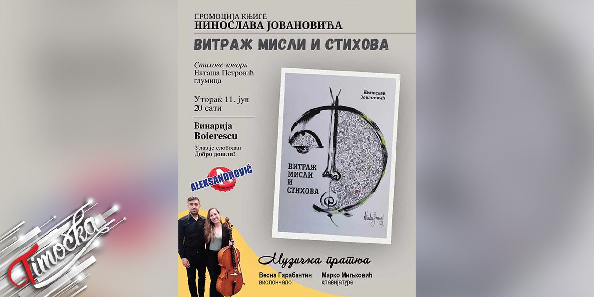 Промоција књиге под називом „Витраж мисли и стихова“ зајечарског писца и сликара Нинослава Јовановића, биће приређенау винарији „Boierescu“ код Неготина, у уторак 11. јуна 2024.