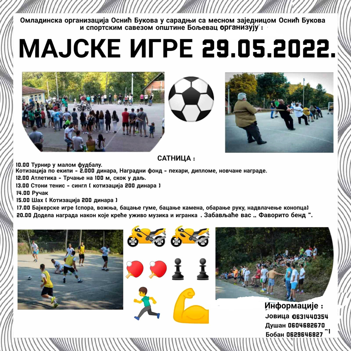 У бољевачком селу Оснић–Буково биће организоване „Мајске игре” у недељу, 29. маја 2022.