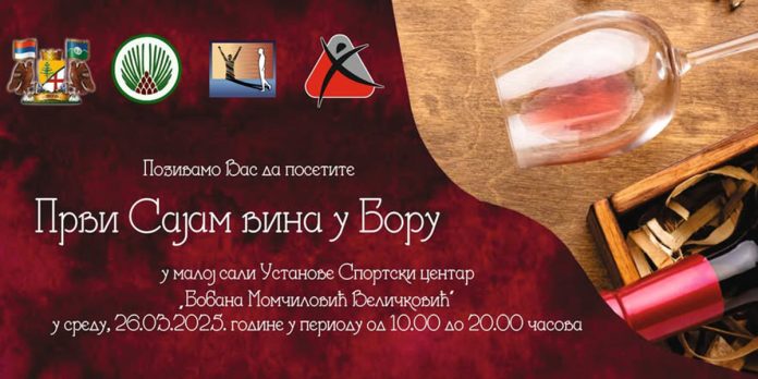 Први Сајам вина у Бору биће одржан у малој сали Установе Спортски центар „Бобана Момчиловић Величковић“, у среду, 26. марта 2025.