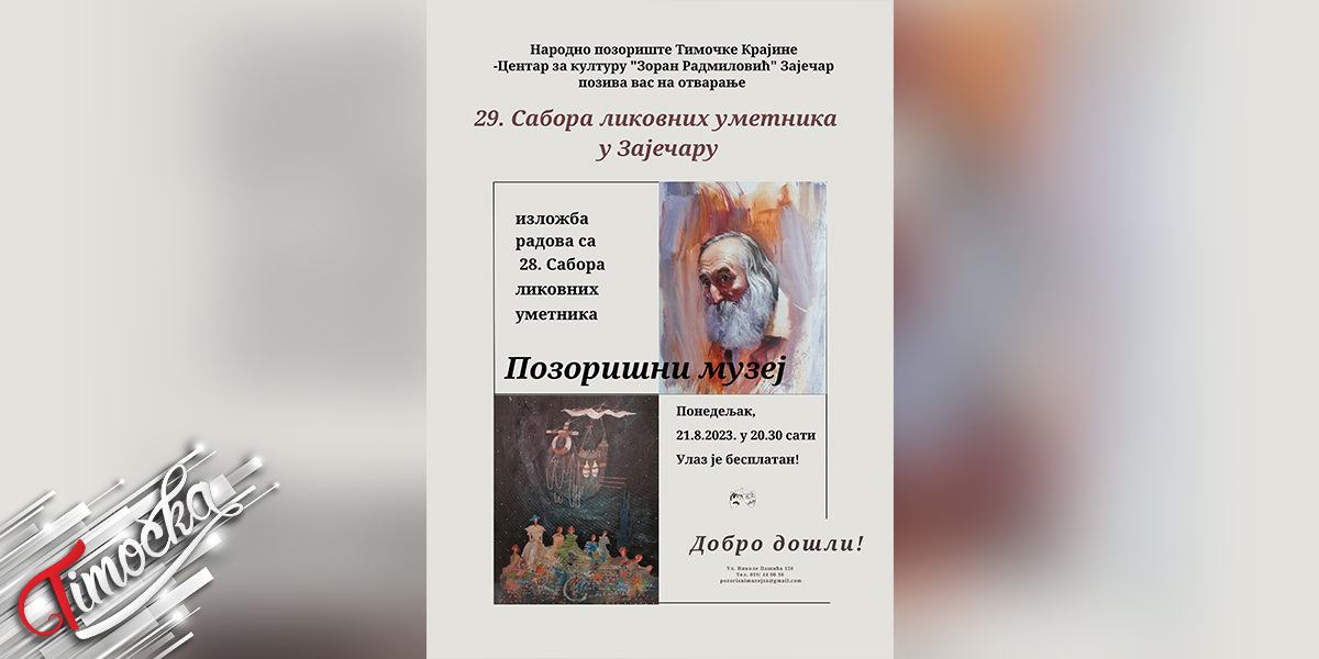 У Позоришном музеју у Зајечару биће отворен 29. Сабор ликовних уметника, као и изложба радова са прошлогодишњег 28. Сабора ликовних уметника који је одржан у зајечарском позоришту, у понедељак 21. августа 2023.