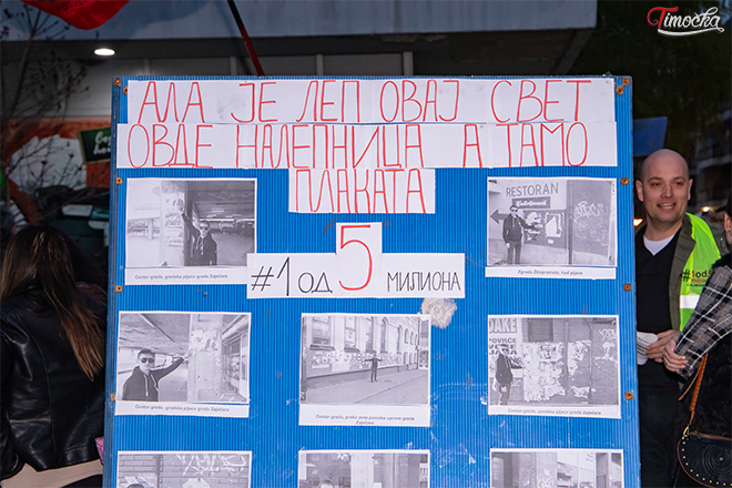 Овог петка су пре почетка протеста грађани паноом „Ала је леп овај свет — овде налепница, а тамо плаката” указали представницима градске власти да је Зајечар препун огласа, налепница и плаката залепљених на местима која за то нису предвиђена и да због тога од стране припадника одељења комуналне полиције још нико није санкционисан.