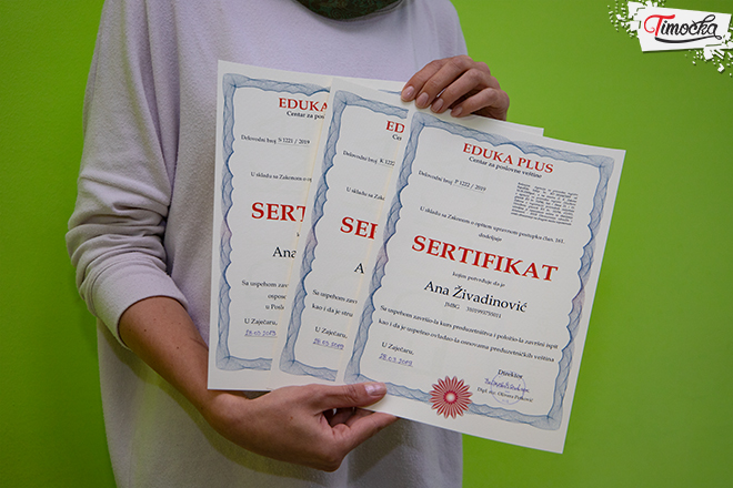 • „Sertifikati se dobijaju po isplaćivanju celokupnog iznosa obuka. Obuke i ispiti se polažu u prostorijama ’Eksterne’ DOO u Zaječaru, ispite uglavnom ja držim”, kaže Aleksandra Mladenović, vlasnica firme „Eksterna” DOO.