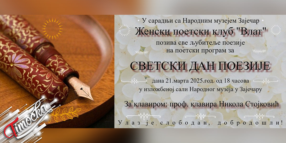 Поводом Светског дана поезије – 21. марта, Женски поетски клуб „Влат“, који је недавно прославио десет година постојања, рада и наступања, у сарадњи са Народним музејем Зајечар организује свечано обележавање поетско музичким програмом, у изложбеној сали Народног музеја у Зајечару.